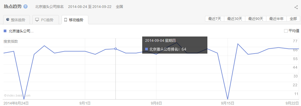 下面,我們來分析關鍵詞“北京獵頭公司排名”的熱點趨勢, 參考“北京獵頭公司排名”整體、PC以及移動最近30天的熱點趨勢圖: